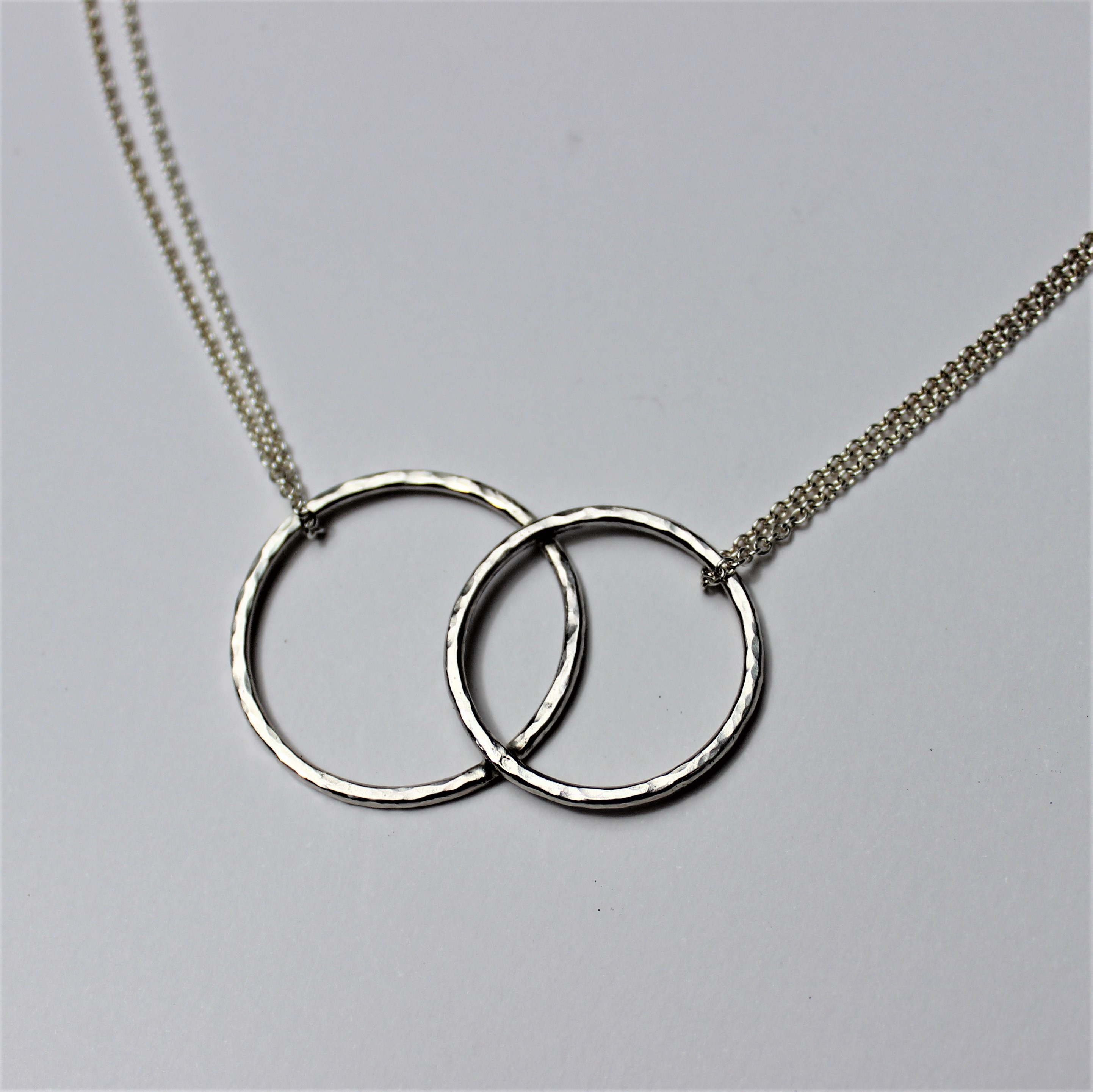 Two hammered sterling silver circles are layered together to create a versatile pendant on a double sterling silver chain with lobster clasp and extension cord.