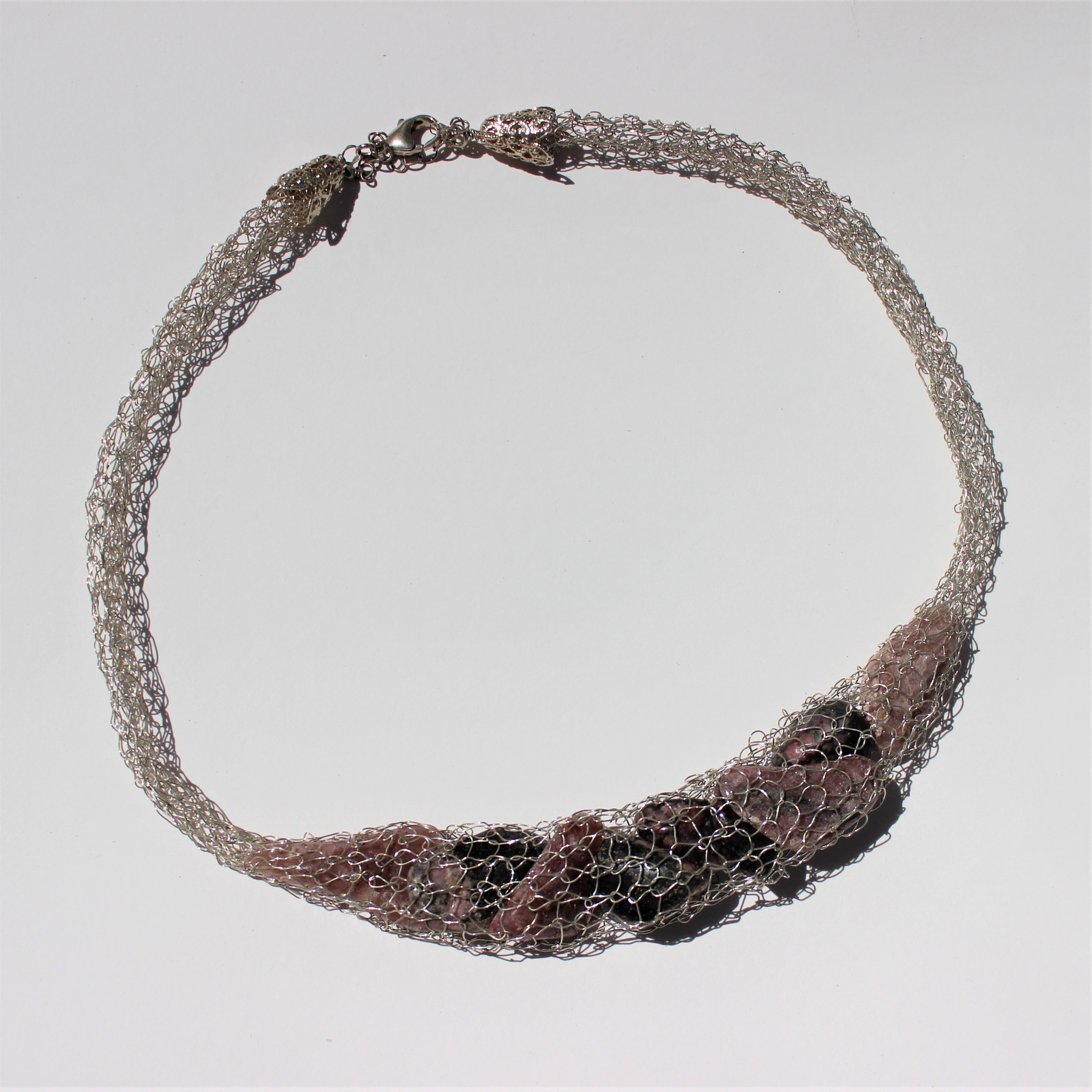 Knit Sterling Silver Necklace with Pink and Black Stones