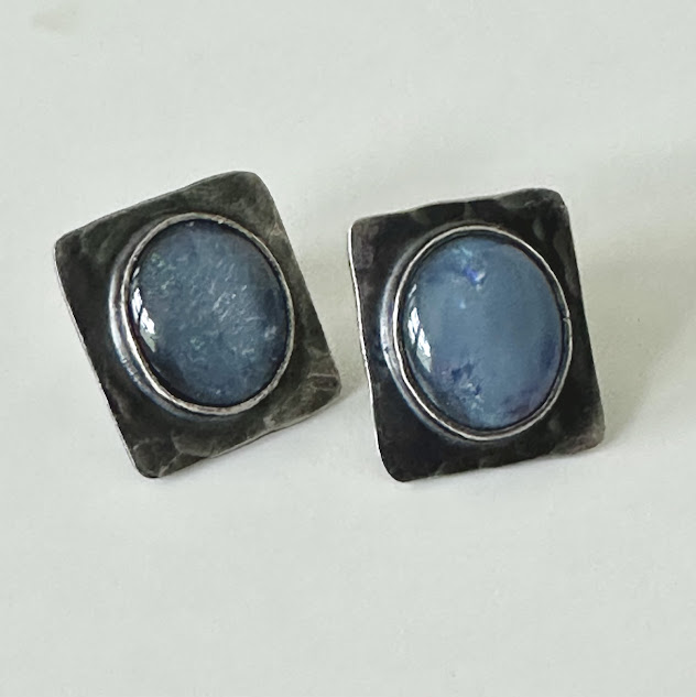Oval opals are set on 1/2 x 3/4in hammered sterling rectangular post earrings