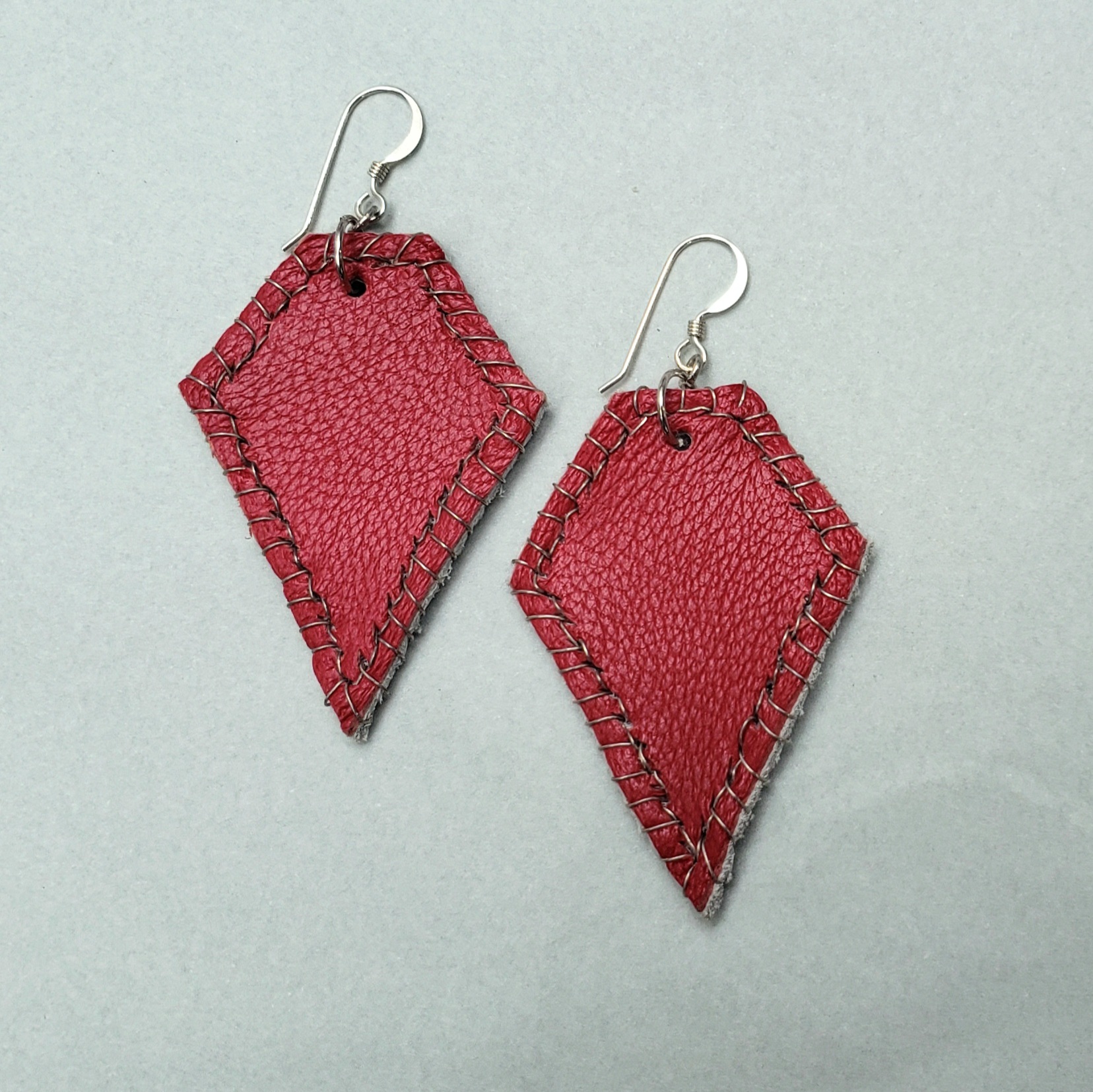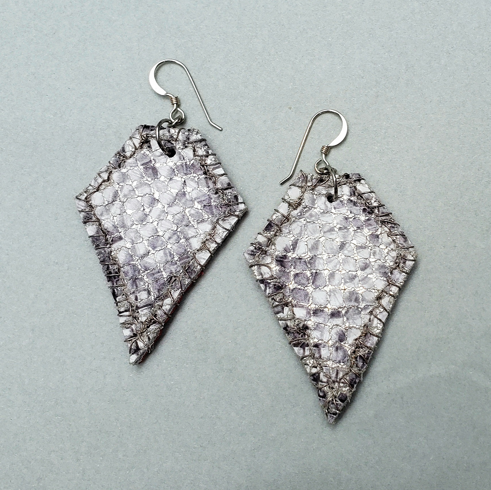 2 layers of hand-cut leather stitched with sterling silver wire on a sterling silver earwire. Black, white and silver snakeskin leather on front (real leather/fake print) red leather on back.