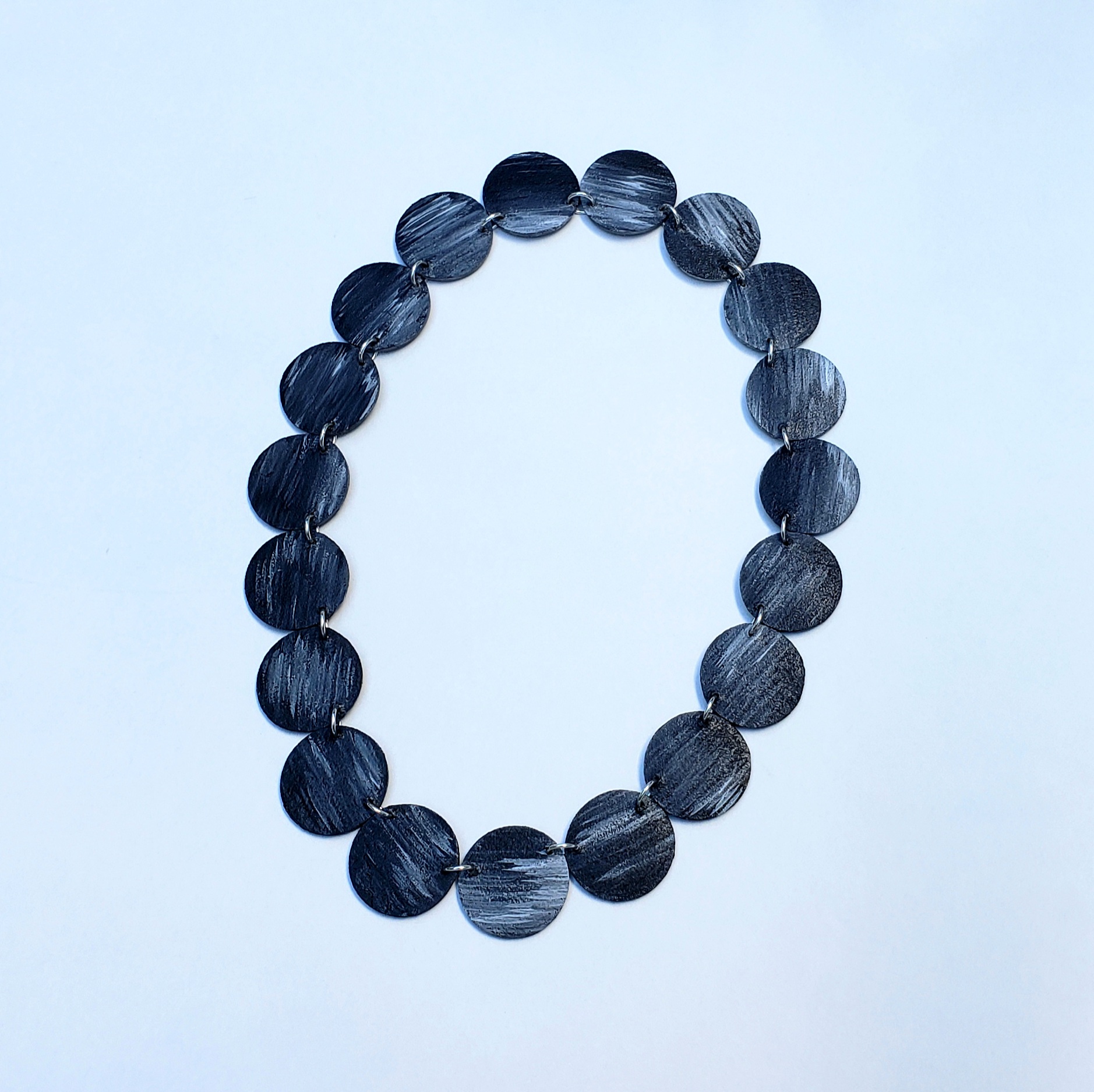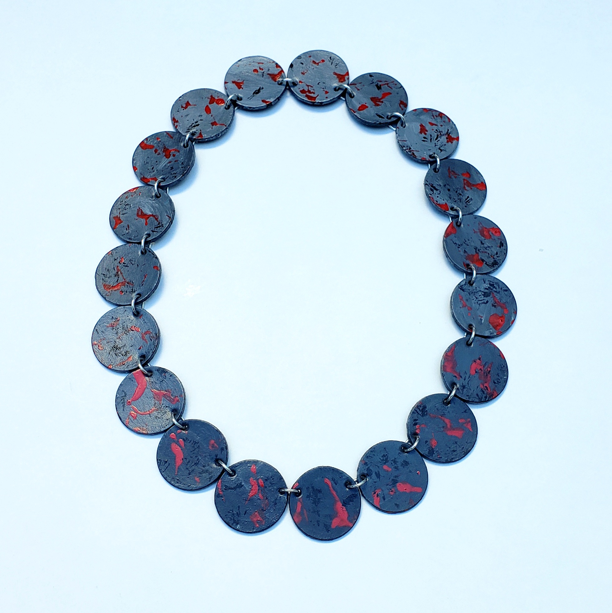 Each leather circle on this necklace is hand cut and hand painted. 24 inches so it fits over the head.