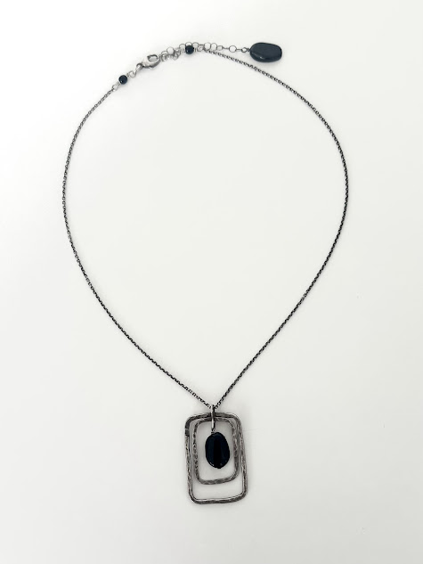 This 1 x 1 1/2in hammered sterling silver with a black onyx pendant hangs from a 16 1/2in sterling silver chain with a 2 inch extension chain.