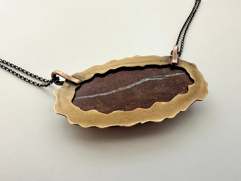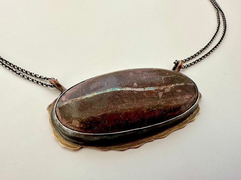 A thin vein of opal runs through and oval shaped stone set in brass and sterling silver with a cut out design on the back. The pendant hangs on a sterling silver doble chain and the totals ----- in length.